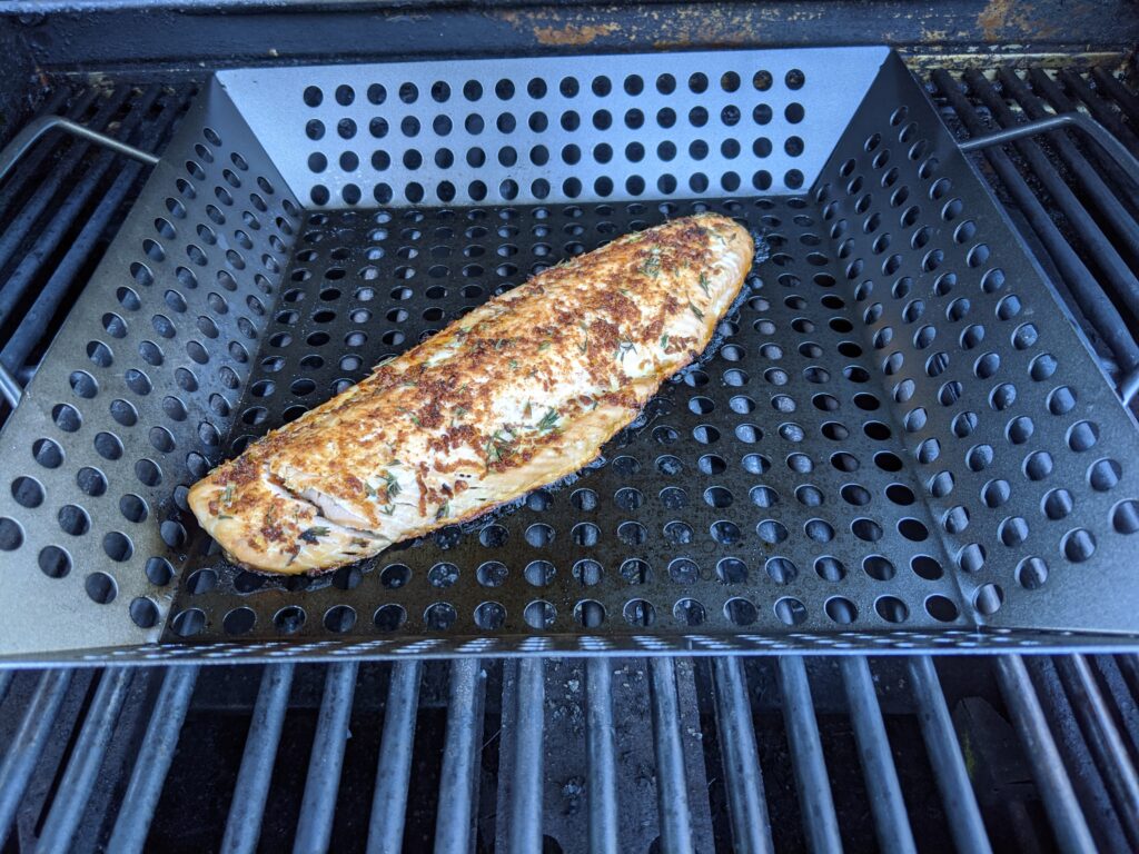 2. Lay salmon, skin down in a perforated basket on the BBQ.Turn down the heat to medium. Check the salmon after 8 minutes. When not done leave for another couple minutes. It depends on the thickness of the salmon. Mine was done in 8 minutes.